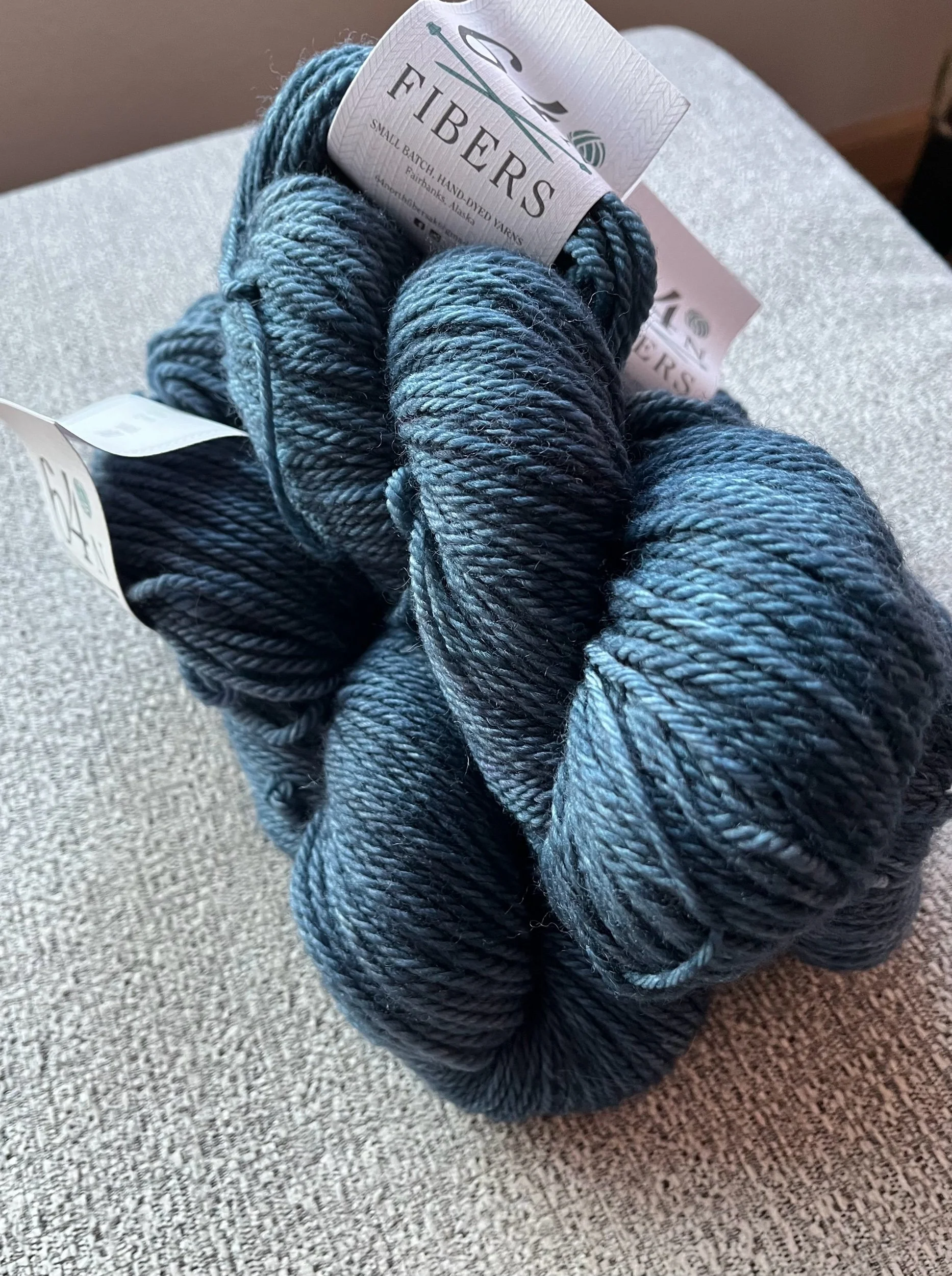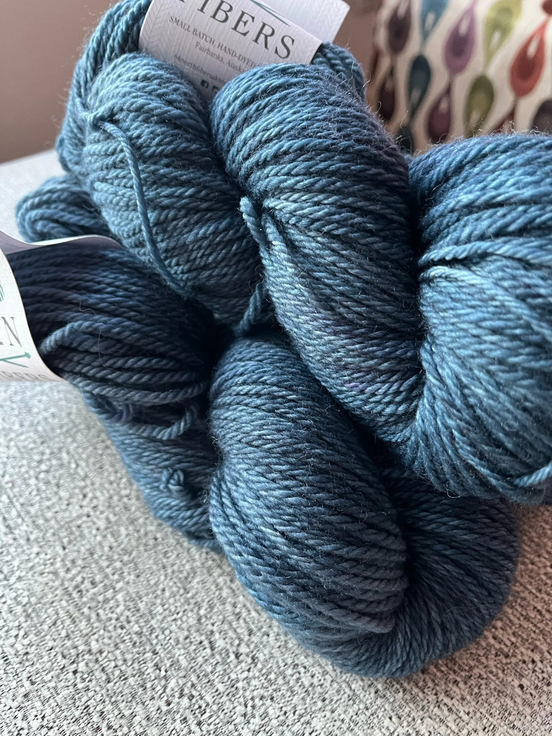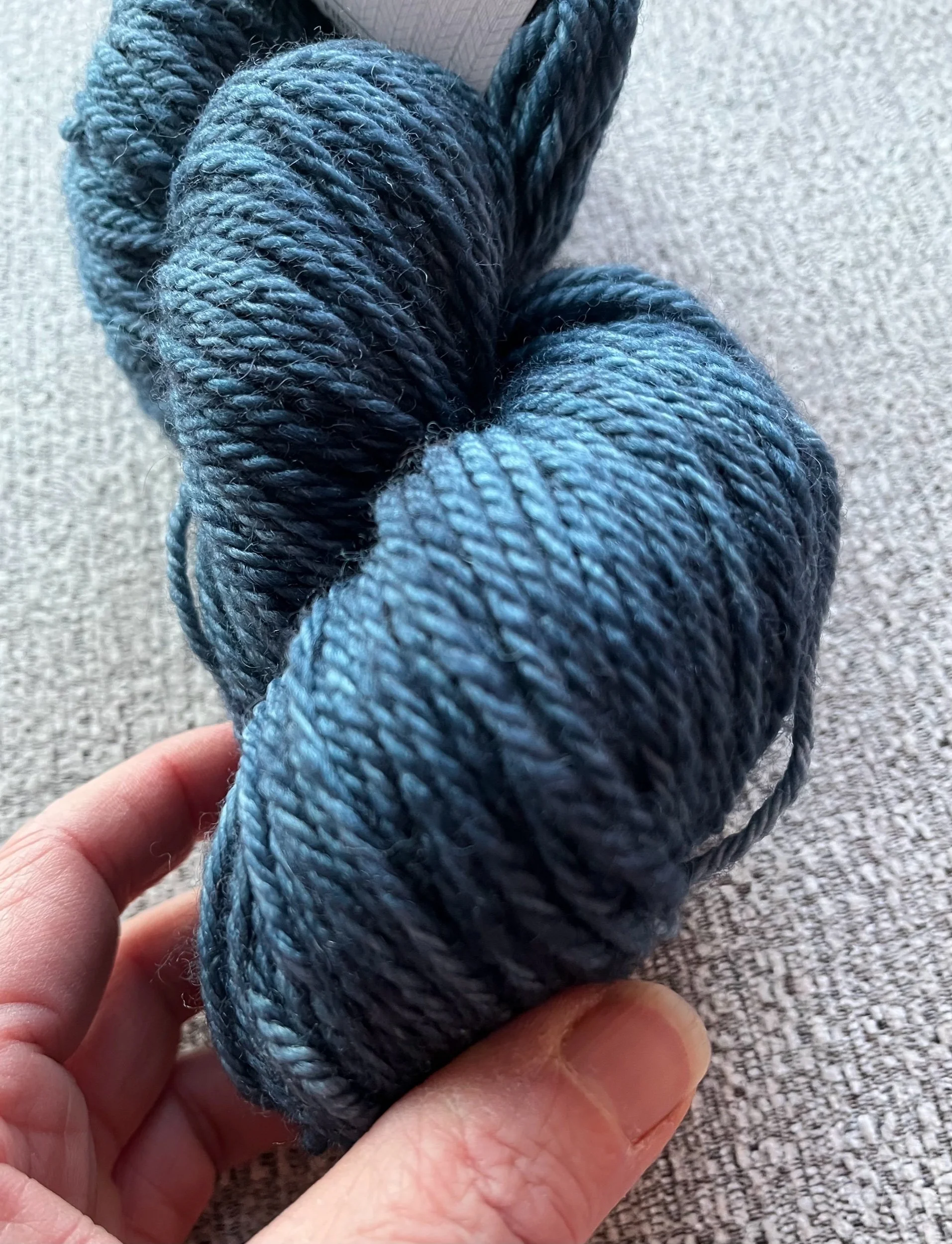 Silky soft and bouncy 4 ply Bluefaced Leicester shows off this deep dusky blue color nicely.