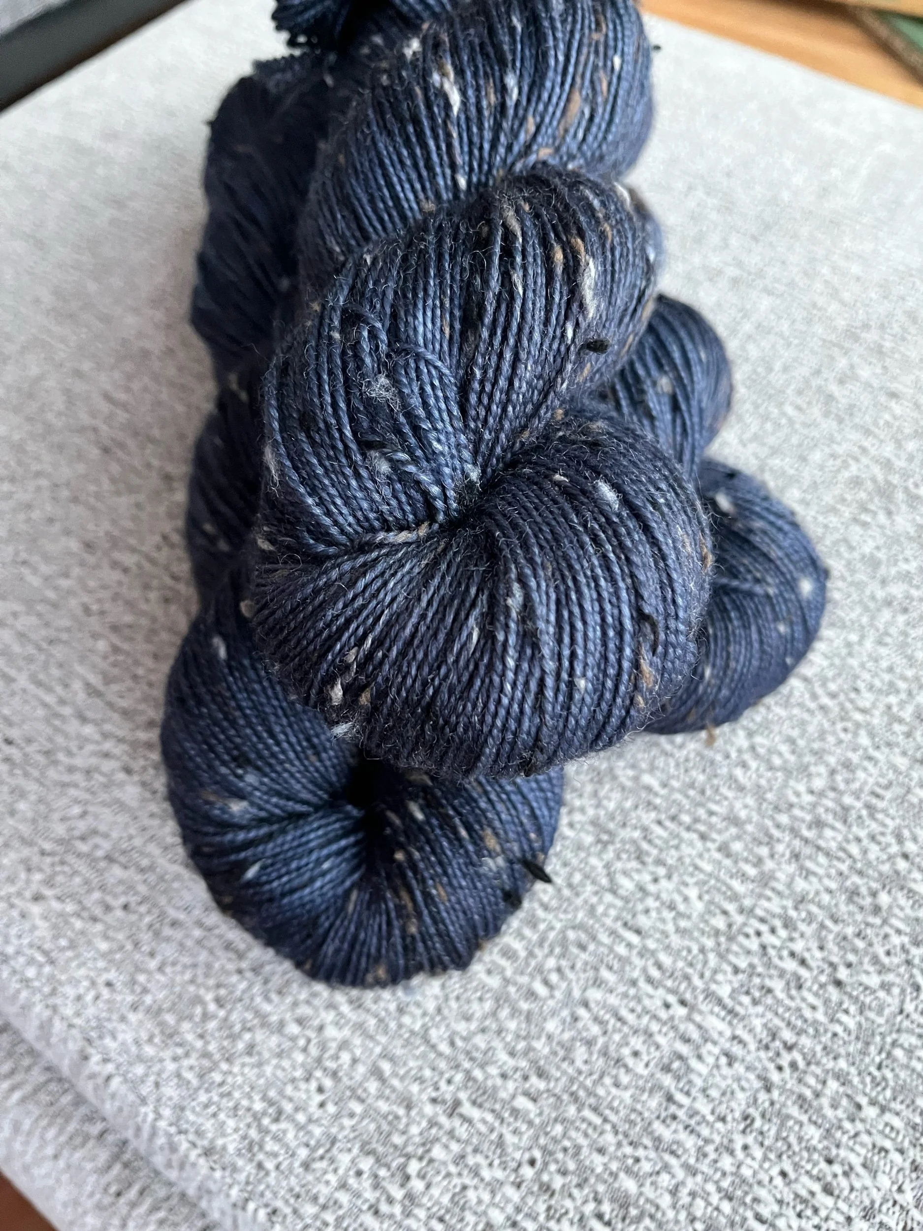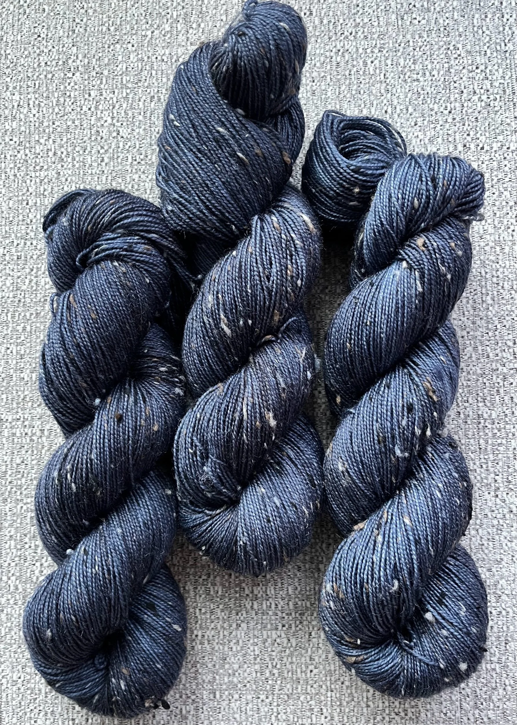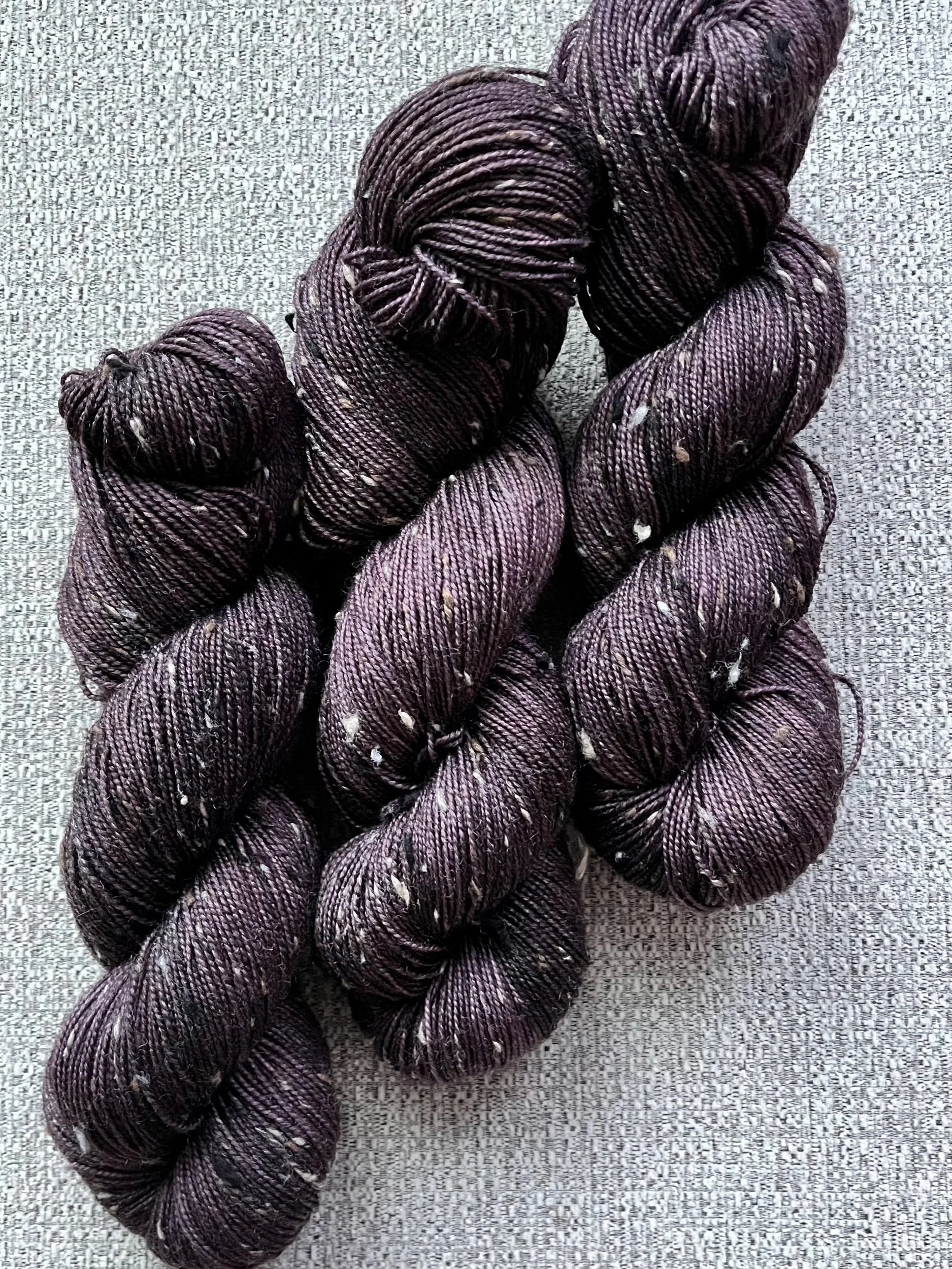 Fingering weight merino wool with flecks of  tweed spun throughout.