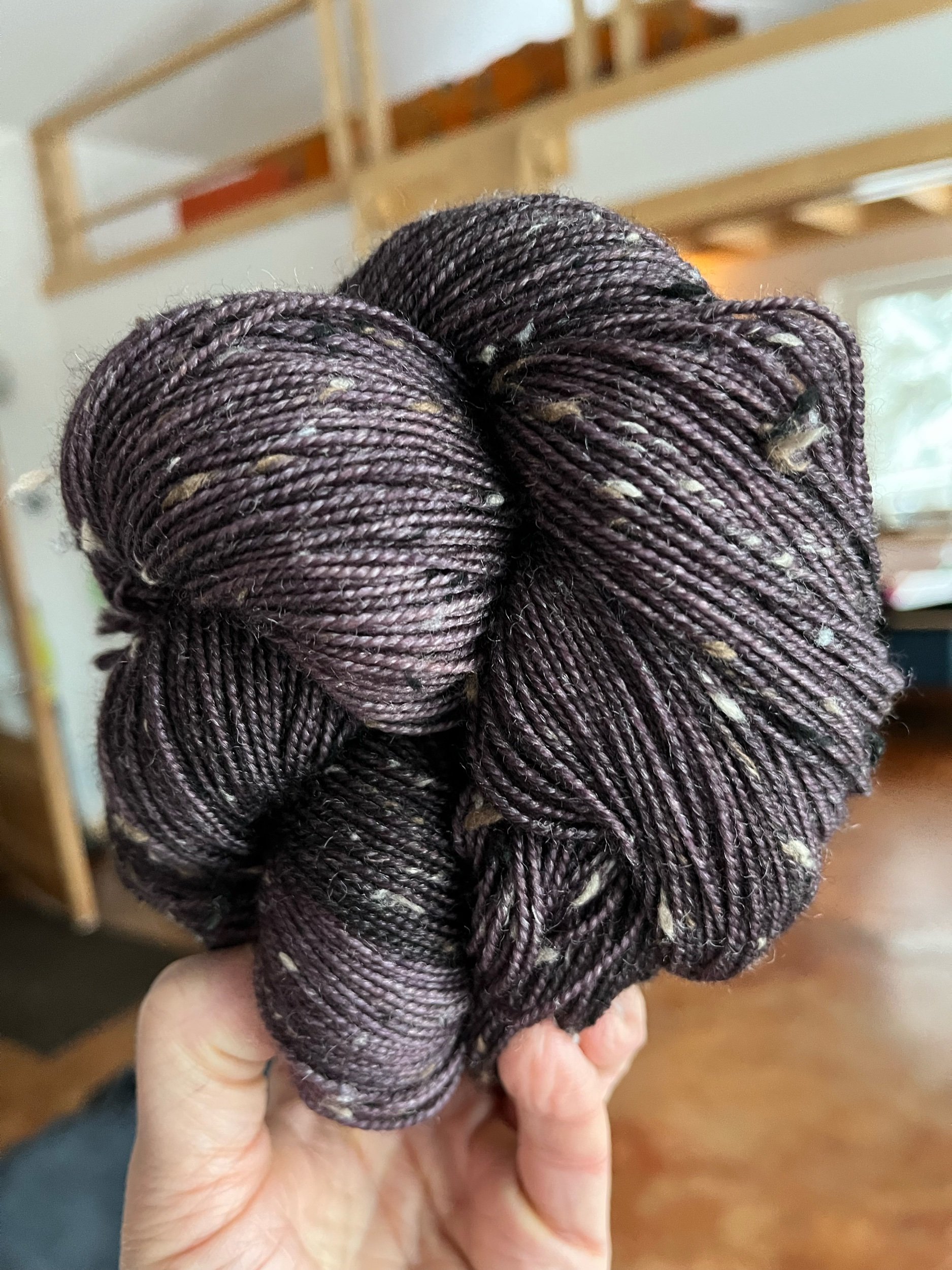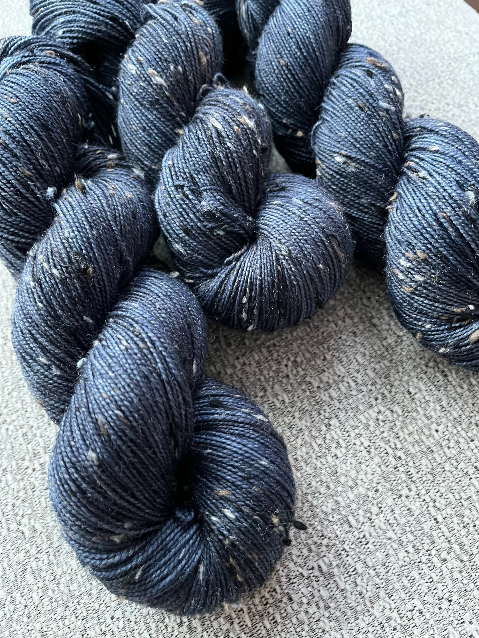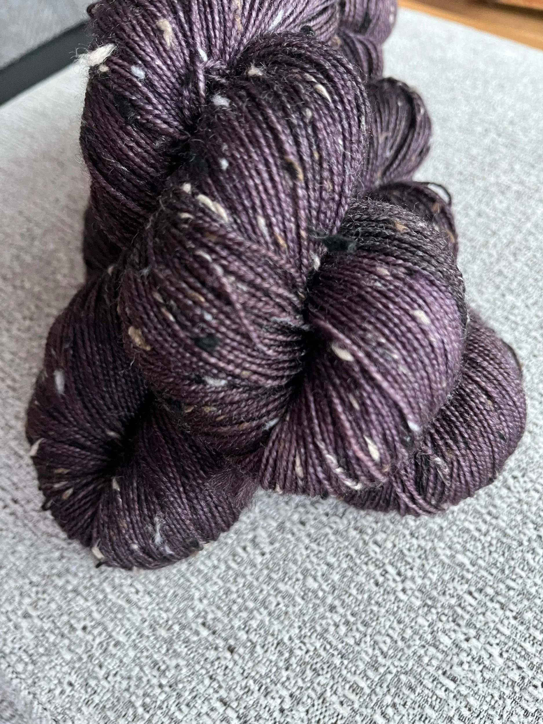 Fingering weight merino wool with flecks of  tweed spun throughout.